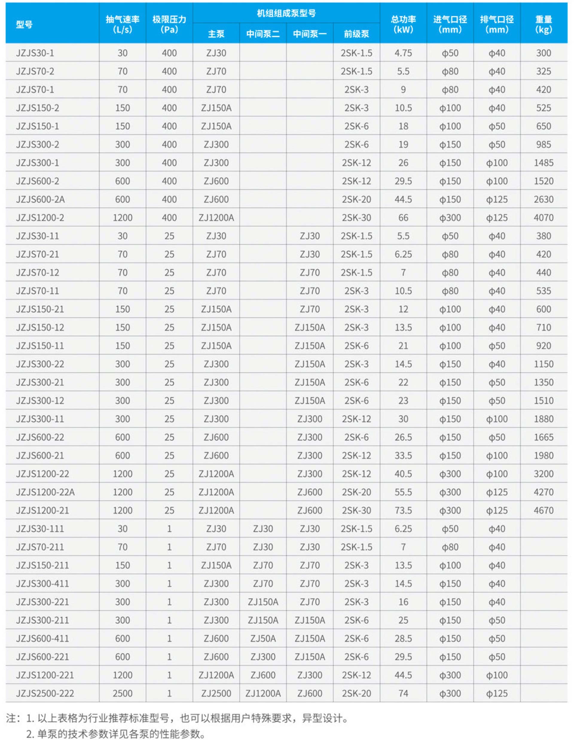 JZJS型機(jī)組主要是由二大部分組成,即泵部分(抽氣部分)和電源控制部分,JZJS三級(jí)機(jī)組的泵部分是由兩臺(tái)羅茨真空泵和一臺(tái)雙極水環(huán)式真空泵三級(jí)串聯(lián)而成,其中雙極水環(huán)泵叫做前級(jí)泵,與被抽容器相聯(lián)的羅茨真空泵叫做主泵級(jí),與前級(jí)和主泵級(jí)相聯(lián)的一級(jí)羅茨真空泵叫做中間級(jí),如果去掉中間級(jí)羅茨真空泵,就構(gòu)成JZJS二級(jí)機(jī)組。三級(jí)機(jī)組的極限真空可比二級(jí)機(jī)組的極限真空提高一個(gè)數(shù)量級(jí)而進(jìn)入25Pa或更高。 由于普通型羅茨真空泵不能在大氣下啟動(dòng),故需在其排氣端預(yù)先抽成真空,然后再啟動(dòng),所以在羅茨真空泵出口須配備前級(jí)真空泵(簡(jiǎn)稱(chēng)前級(jí)泵)作為預(yù)抽泵。對(duì)于JZJS三級(jí)機(jī)組而言,主泵級(jí)的前級(jí)泵是中間級(jí),中間級(jí)的前級(jí)泵為雙極水環(huán)泵。對(duì)于JZJS二級(jí)機(jī)組而言,主泵級(jí)的前級(jí)泵即為雙極水環(huán)泵。 各級(jí)真空泵之間抽速比(后級(jí)泵抽速與前級(jí)泵抽速相比)要符合一定的比例??紤]到在高抽速比下前級(jí)泵配用功率和抽排氣能力的不足對(duì)后級(jí)真空泵的不利影響。一般抽速比不宜大于3,而以取抽速比為2左右為佳。 由于羅茨真空泵具有優(yōu)良的抽氣特性(在低壓下具有大的抽速),且在羅茨真空泵的極限真空范圍內(nèi)使用羅茨真空泵作為后級(jí)泵,總能比前級(jí)真空泵提高一個(gè)數(shù)量級(jí)的真空度(如前級(jí)真空度為100Pa那未使用羅茨真空泵作后級(jí)泵,就可提高到10Pa,余類(lèi)推)。由于羅茨真空泵的轉(zhuǎn)子與轉(zhuǎn)子,轉(zhuǎn)子與泵腔均無(wú)機(jī)械接觸,無(wú)需潤(rùn)滑,故其功率損耗就明顯小于具有相同抽速的其他類(lèi)機(jī)械真空泵。又由于JZJS型機(jī)組配備雙極水環(huán)泵作為前級(jí)泵,所以對(duì)抽除具有一定腐蝕性,含水蒸氣量大的工業(yè)流程特別適宜。